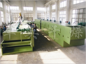 物料由加料器均匀地铺在网带上,网带一般采用12-60目不锈钢丝网,由传动装置拖动在干燥机内移动。干燥机由若干单元组成,每一单元热风独立循环,部分尾气由专门排湿风机排出,废气由调节阀控制,热气由下往上或由上往下穿过铺满物料的网带完成热量与质量传递的进程,带走物料水份。网带缓慢移动,运行速度可根据物料温度自由调节,干燥后的成品连续落入收料器中。上下循环单元根据用户需要可灵活配备,单元数量亦可根据需要选取。